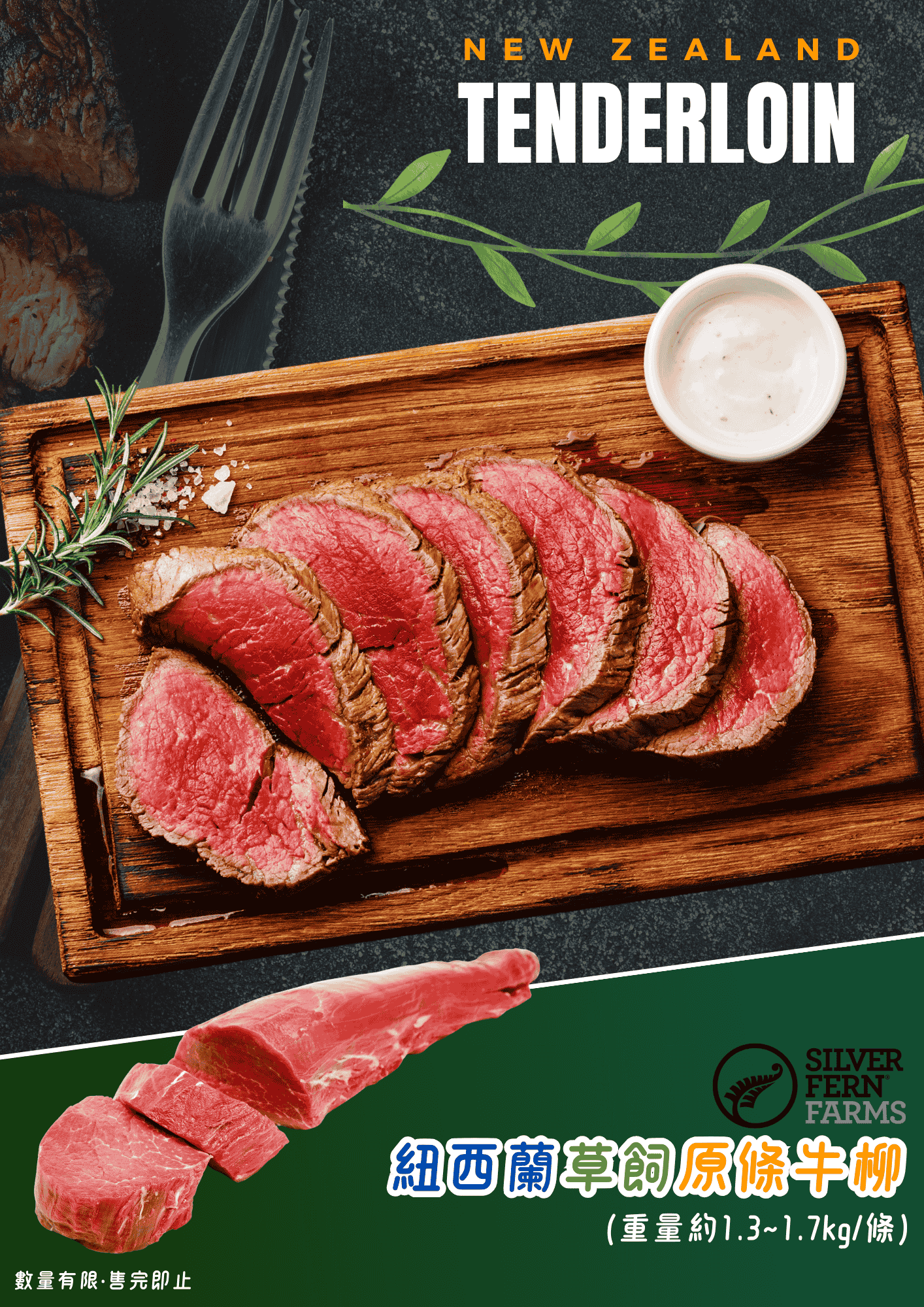紐西蘭 Silver Fern Farms 草飼無激素原條牛柳 (約1.3~1.7KG/條) - 牛類